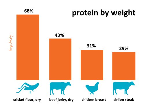 On top of the nutritional value, crickets need little food and water (1,000 times less than cows) and they grow astonishingly quickly. Crickets require only 2 kg of feed to make 1 kg of protein, yet a cow needs 10 kg! Clearly, they convert food into protein in a much more effective way than any other farm animal.
